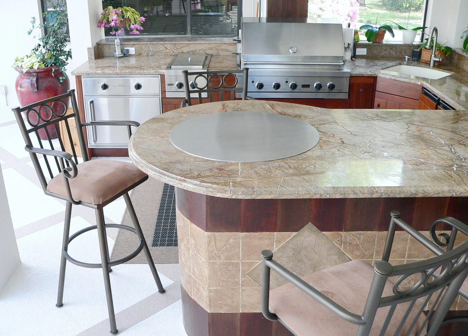 The heating element is completely enclosed and insulated. Heat is only transmitted into the cooking center surface above not to the surrounding areas. Can be built into: kitchen counter tops e.g. granite steel wood tile carts barbecue/grill islands outdoor kitchens dining tables kitchen islands . . . The sky is the limit.