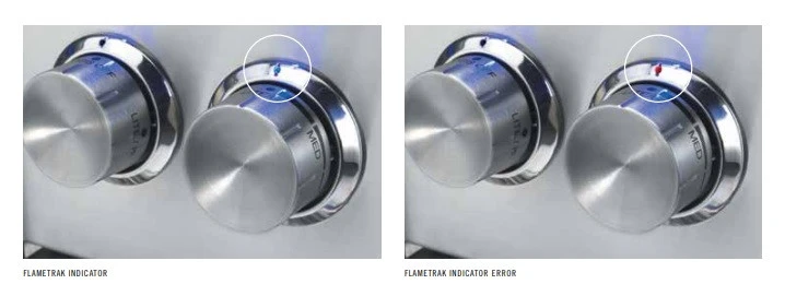 The Flametrak system will notify you with the indicator that is above each knob when any action has been taken. This allows you to check the flame’s status rather than opening the grill hood.
