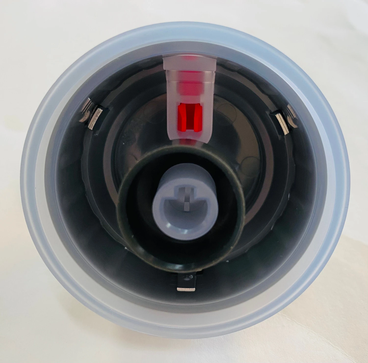 This Weber knob has a gray plastic body with a chrome trim it also has a translucent rim for emitting light and a red position indicator. Â